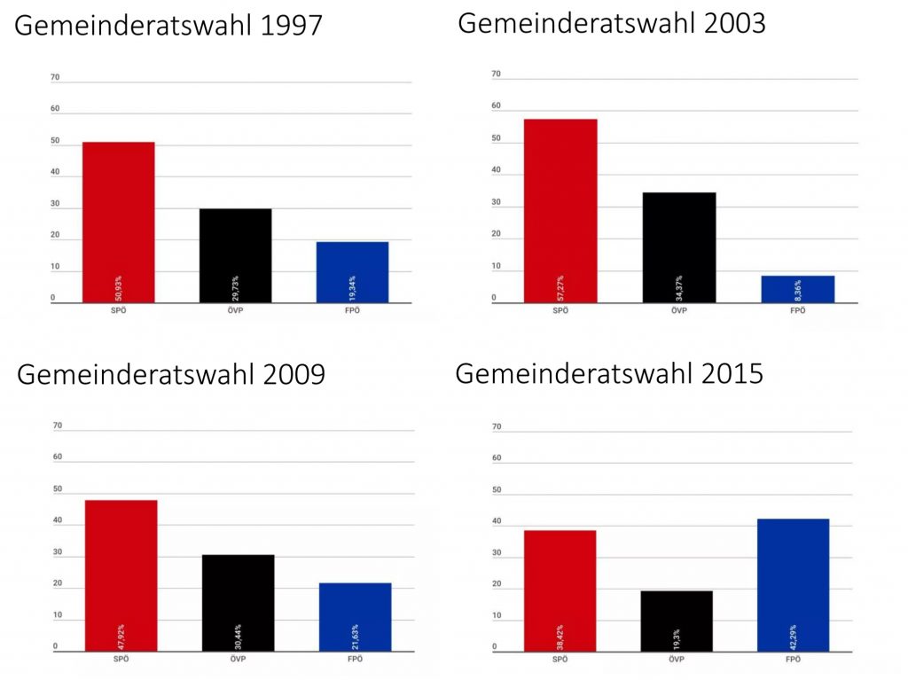 Die Ergebnisse der letzten Wahlen auf Gemeinde-, Landes-, Bundes- und Europaebene